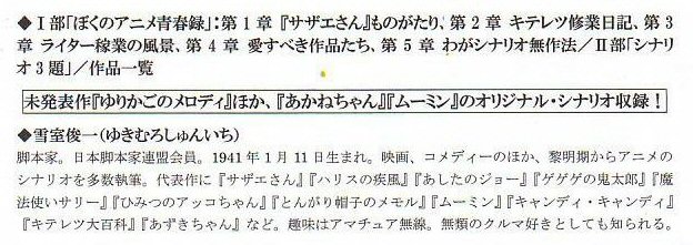 あるときは、「アッコちゃん」が変身する呪文をを発明し、あるときは、「ノリスケさん」ちのひとり息子を「イクラ」と命名。原作がたった3巻の『キテレツ大百科』から270本近くのお話を作り、作品ナンバー1番を書いた『サザエさん』は、37年後の今や1,000本を超えても、なお執筆中・・・。日本のテレビアニメの黎明期(レイメイキ:新しい時代が始まろうとする時期)から、その歴史とともに走り続けるベテラン脚本家が、自ら体験したあの時代、あの作品、あの人を、縦横無尽に語り尽くす。アニメファンのみならず、かつての少年少女必読の自伝的エッセイ。書き下ろしです。