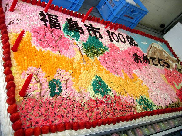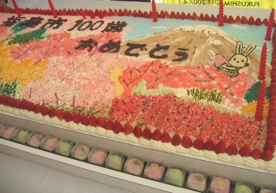 4月1日に駅前で行われた福島市100歳おめでとうのケ ーキの写真です。福島菓子協同組合で作りました。大きさは1 80センチ×90センチで約450人分です。ケーキの周りは 、花を模った上生菓子を並べました。