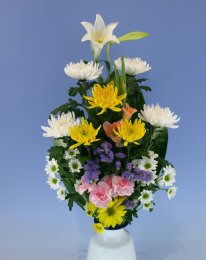 花は、色合い(白で、白に少しピンク、白に青系等)花材お任せなら季節の花を使い、お得な組み合わせを致します。