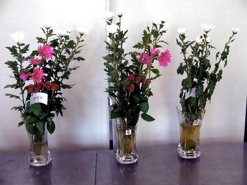 | 実験一週間目です。明らかに差のついた3点。(最初は5本×3種類ありました。) 左からパージウォーター(強酸性電解液)・水・水です。圧倒的にパージウォーターが勝っています。今回は、知らすに原液で使用しましたが、5倍程度に薄めてもよいそうです。器具は、少々高価?ですが、手間や安全性・ロスの軽減等を考えると商売道具としては安いので購入を考えています。中央は、鮮度保持シートで包んだ物です。水は完全に腐敗しているのに菊・バラ共に元気・ガーベラ2本腐敗、3本花は終わりかけでも茎はとっても元気です。腐った水でもこれだけ頑張っているのは驚きです。(水はドロドロ状態で大変臭く早く実験を終らせたいです。)参加店の皆様へ来週29日(木)も唯茂君出張の為訪問は出来ませんが、花屋は8月第一週までは、暇な時期なので更新のある方は早めにお持ち下さい。 |