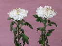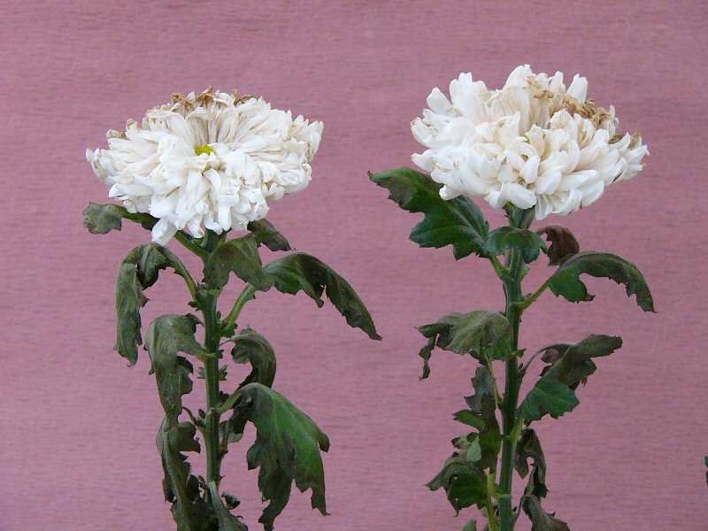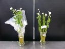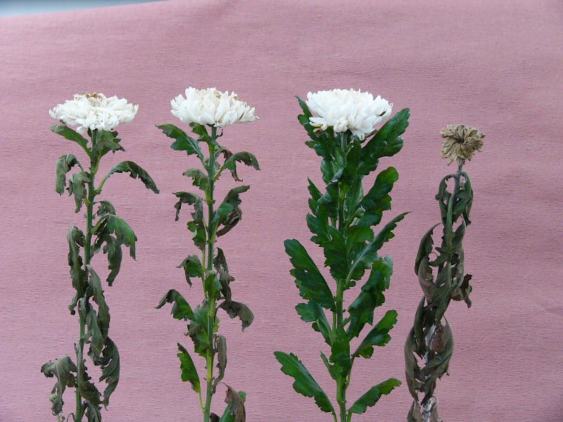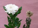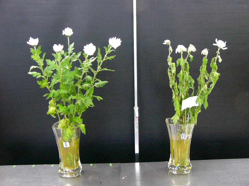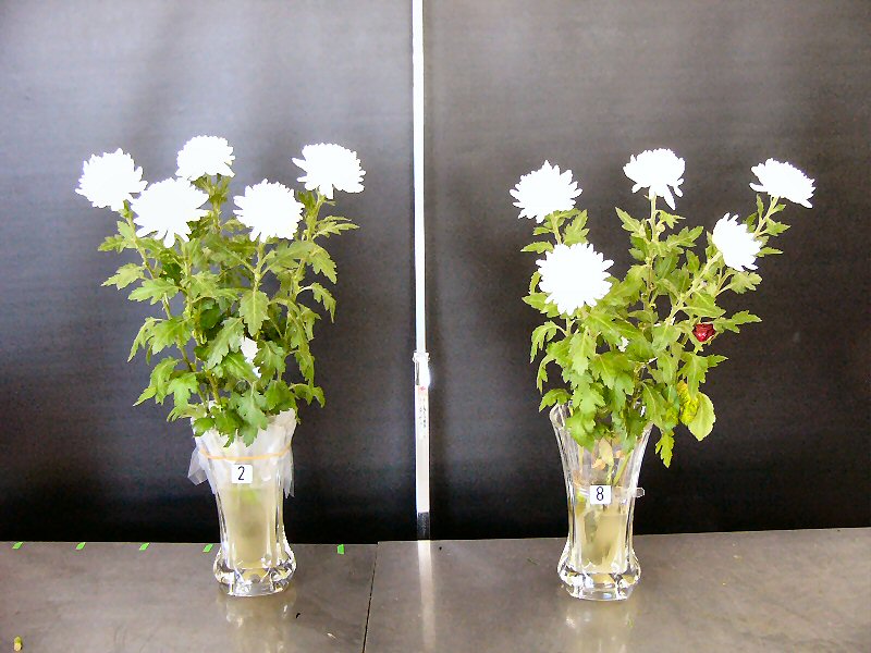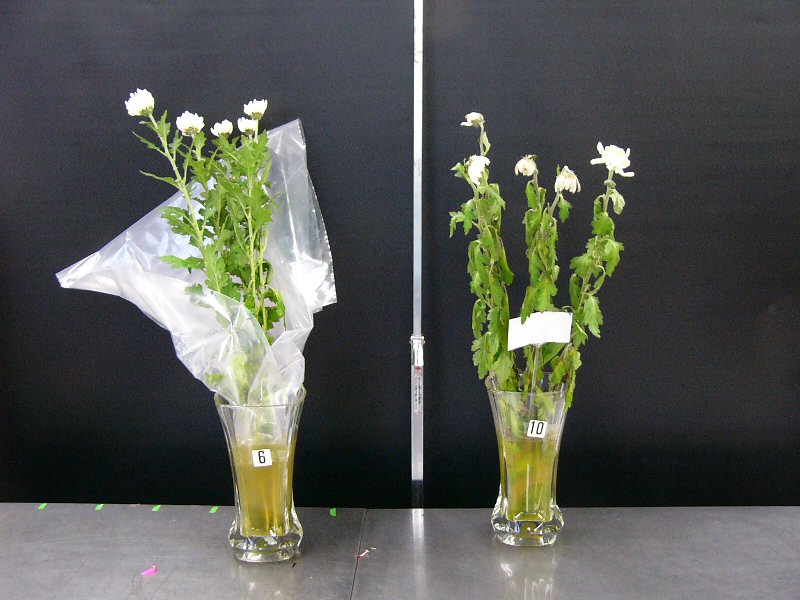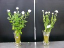 | 画像は、まだ頑張っている菊です。両方とも切花活力剤入りの水ですが、葉も花もしっかりしている左側の花瓶には内側にEMシートが入っています。水の腐敗を抑え花に栄養を与える切花活力剤にEMがうまく働いた結果だと思います。尚、EMシートで包んだ菊の葉も元気ですが、水が臭いので邪魔にされています。 | |||