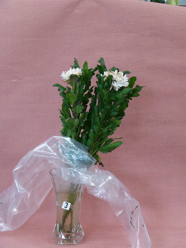 | 右画像は、実験40日目です。さすがに花はダメですが、葉は元気なので、もう少し様子を見る事になりました。(次回は、もっと早く結果の出る花にしたいと思います) |