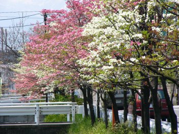 右は、前を流れる祓川のハナミズキ |