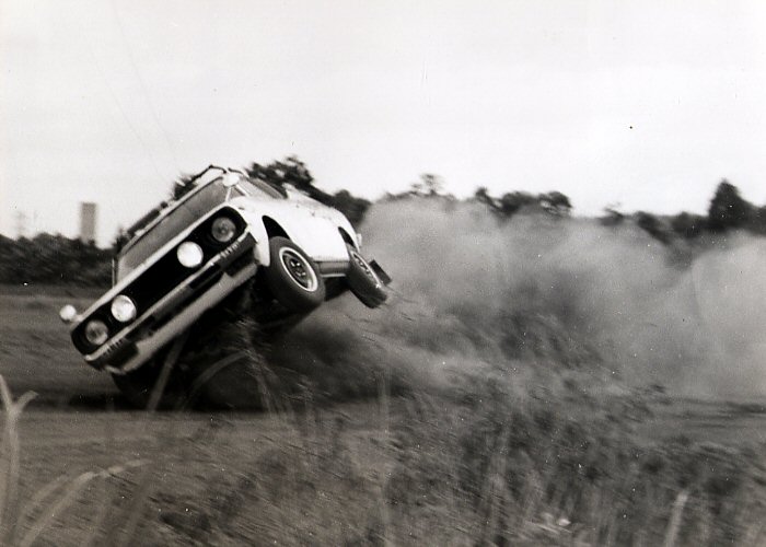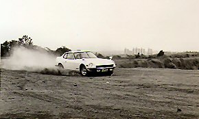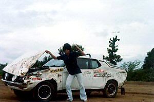 画像は、彼にしては少し物足りないと思う転倒シーンです。コーナーの出口でカメラを構えてパシャ!顔を上げると、車が立っている?次に見えた時、車は私から数mの所に止まっていました。慌てて駆け寄りエンジンを切らせ、ケガを確認すると肩から少々出血しているのみでした。私は、彼が四輪ドリフトするのを予測してシャッターを切ったのですが、彼は、2輪走行⇒裏返し?⇒フロントを下にして直立(私には車の下面が見えた)⇒砂埃で見えなくなり⇒3〜4mの所に進行方向に向かって普通に?止まっていた。もちろん車は全損でした。
