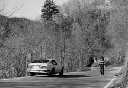 | A最初からアニメの真似はしないように。画像は、私がオヤジになる前の物。コーナーへの進入速度を見誤り原因を足で確かめていたところです。元テストドライバーのM君に速く走る方法を聞くと、「アクセル全開でブレーキを踏まなければ良いんだよ!」と教えられ“各キヤ共アクセル全開でレッドゾーン手前まで回しブレーキはなるべく踏まない”と解釈し実行。この写真の十数分後、下り3速全開、ゆるい右カーブで一瞬ブレーキを踏むとペダルが“フニャ、ガツン”と床(ストッパー)に当たりブレーキが故障。そして左ヘアピンカーブへ突っ込むなんて、この時は想像もできなかった。アニメの中では、頻繁にブレーキが真っ赤になるシーンが出てきますが、へたっぴがやるとブレーキオイルが沸騰して怖い思いをするよ。という内容の失敗ドラテク講座かな? |