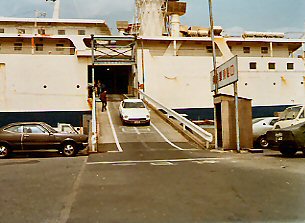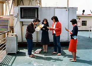 | メンバーは、私、B君、U君それにM君の4人。前夜から降り出した嵐のような雨は朝まで降り続き出発が危ぶまれました。晴海のフェリー乗り場で私は3人に「近くの女の子はいないと思うので本気にならないように。」と。B君「はーい!」と、全く相手にしていない様子。U君「分かってるよ。」。M君「当たり前じゃないかー。」と。なんか・・・とっても不安・・・。 B君。キャロル風に「おーいお前らー!今日は天気悪いけど乗れよなー!」で出発。 |