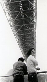 | 左、B君と客室乗務員のお姉さん。ピンクレディのミーちゃんに似ている???と追い回し、とうとう写真を撮らせてもらいました。酔っ払いが大変ご迷惑をおかけしました。中央、関門橋の下を通過。右、小倉に上陸(出口の段差でカメ状態になり、床をこすりながらやっと出たところ、心配して見に来た人、暇で写真を撮っていた人がいました。) | ||||||