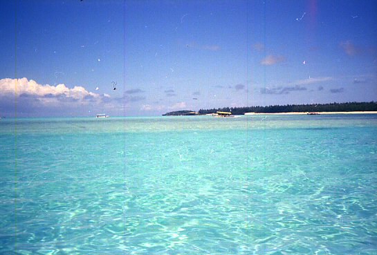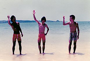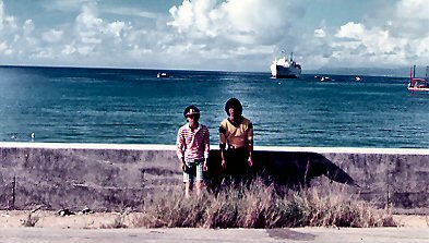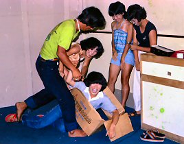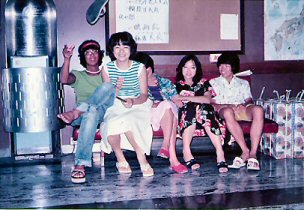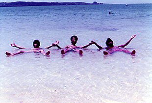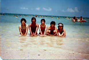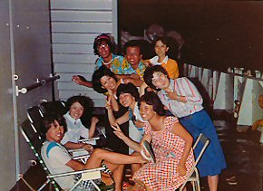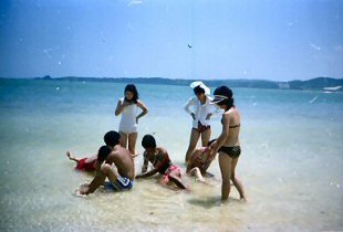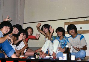 B君が先生となってディスコのダンス教室?ホールにはディスコの音楽が鳴り響き、女の子達が楽しそうに踊っていました。それが終わると写真のような状態で宴会。B君とチェックのパンツのおかげで?孤立した夏の旅は、小さいながら昼は楽園、夜は動く龍宮城のような、私達の為の旅?となりました。 |