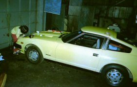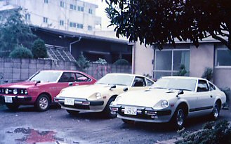 左、転倒の為。今回も一足先に乗り替えたB君のオースター。チェリーFUでの経験を生かし?ロールバー装備のラリー仕様。中央、私のZ。右、M君の280Z-T。この時、M君のお兄さんも一緒に280Z-Tを購入したので、同じ人が3台のZを受注したようです。ここにX君とN君が来ると。白と黄色のRX-7が加わり。無線で指示をすれば、編隊飛行のようなチョット楽しい走りも可能でした。