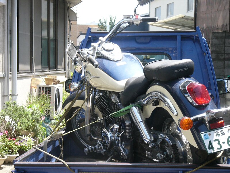 唯茂君のバイクが車検の為、お出かけです。バイク屋さん「2年間で何キロ走ったと思います?」と。「3キロ?」。「5キロ?」と。バイク屋さん「じゃー、17キロは沢山走ったんですね。」と。あまり乗らないのでタイヤが変形している32(サンニー)があるようですが。置いてあるだけのバイクです。