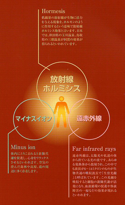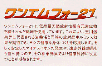 | Q・値段が高いのでは? A・確かに普通のふとんと比較すると高価ですが、毎日身体を健康にする効果を考えると、価格に見合った内容があります。その高い価値を手に入れていただく寝具です。 Q・「ホルミシス」について解りやすく教えて下さい。 A・「ホルミシス」とはギリシャ語で「生体刺激作用」という意味です。やさしく言えば、強い刺激は身体に悪いが適度な刺激は身体に良い作用をもたらすということです。生物学上では常識とされており、特別な言葉ではありません。例えば、お酒を1日1升飲むことは身体に有害ですが、1合程度なら「百薬の長」と言われています。私たちの周りにはそのような例が無数にあります。これらを「ホルミシス効果」と言います。 Q・それでは、「放射線ホルミシス効果」とは? A・「強い放射線は身体に悪いが、低線量の放射線は身体に良い作用をもたらす」という意味です。近年、日本でも研究と検証が重ねられ、その効果が証明されてきています。 Q・私たちの身近に低線量放射線による「ホルミシス効果」を実感できるものがありますか? A・岩盤浴で有名な秋田県の玉川温泉や鳥取県の三朝温泉、岐阜県のローソク温泉や山梨県の増富温泉等の著名なラジウム温泉やラドン温泉の効果が、「放射線ホルミシス効果」と言われています。 Q・長い使用期間で効果が薄れるのでは? A・天然鉱物を使用していますので、その放射は半永久的です。繊維の1本1本に放射体を練り込んでいるので、剥がれ落ちることなく効果を持続します。 Q・外に干しても大丈夫でしょうか? A・大丈夫です。湿気がこもらず、空気の流れを作る構造なので、風通しの良い場所に広げておくだけで十分乾燥します。 Q・誰にでも効果があるのですか? A・使用してすぐ効果が現れる人もいれば、1ヶ月から3ヶ月で効果が現れる人もいます。効果が自覚できるまでには個人差があります。 |